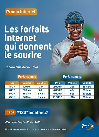 Les offres de Moov Africa sont valables jusqu’au 05 Mars 2023. Le Prix des bonus varie de 2 000 F à 10 000 FCFA. Les forfaits offerts sont respectivement de : 2Go ; 4Go ; 5Go ; 10Go sur 15 jours, 20 jours 30 jours 30 jours. Pour en bénéficier, il faut taper 123montant#.