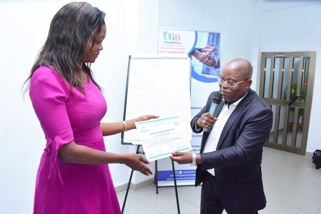 En initiant cette formation, a expliqué François Kougni, Secrétaire général du CGB, l’objectif n’est autre que d’offrir une solution rapide, efficace pour les créanciers et les débiteurs. “Les créances impayées impactent la trésorerie des banques et des entreprises et les empêchent d’atteindre des résultats. Pour éviter tout ça, au lieu que les entreprises aillent devant la juridiction étatique, l’OHADA a prévu des outils et des techniques de recouvrement de ces créances. C’est fort de toutes ces considérations, de tous ces aspects, que le CGB a estimé qu’il faille, faire une thématique et inviter les banques et les entreprises à suivre cette formation”, a-t-il expliqué. Se réjouissant des techniques nouvelles qu’apporte cette formation aux participants, il n’a pas manqué de réitérer son engagement ainsi que celui de son cabinet à promouvoir au Bénin et au-delà, la médiation afin de permettre aux entreprises d’éviter les longues procédures judiciaires, ce qui réduit les coûts et accélère le processus de recouvrement. Au terme des deux jours de session, le formateur principal, Dr Karel Osiris Dogué, a, pour sa part, salué l’assiduité et l’envie d’apprendre qui a caractérisé l’ensemble des participants composé entre autres de Chefs d’entreprises, de responsables des affaires juridiques et du contentieux, de responsables commerciaux et de recouvrement, ainsi que de responsables de la conformité. “Nous devons, a-t-il soutenu dans son mot de clôture, prendre conscience que l’arbre à palabres que nos anciens utilisaient, est une meilleure méthode de règlement des conflits, que d’aller dans les juridictions”.