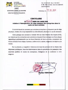 Les acteurs de la chaîne des dépenses publiques et tous les intervenants dans la procédure de passation des marchés publics et toutes les entreprises sont astreintes à la pose d’une enseigne ou d’une plaque signalétique professionnelle sur les lieux d’exercice de leurs activités notamment les locaux abritant leurs sièges, ateliers et usines, magasins de dépôt ou de vente. C’est dans une note circulaire en date du 10 mai 202 et signée du Directeur Général, Nicolas Yènoussi que la Direction Générale des Impôts (DGI) porte l’information au public.