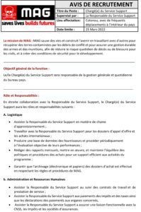 Pour atteindre ses objectifs et satisfaire ses clients MAG lance un avis de recrutement au poste du Chargé du Service Support qui sera responsable de la gestion générale et quotidienne du bureau pays. MAG sauve des vies et construit l’avenir en travaillant avec d’autres pour récupérer des terres contaminées par les débris de conflit et pour assurer une gestion durable des armes et des munitions, afin de réduire le risque quotidien de décès ou de blessure pour les civils, et à créer des conditions de sécurité pour le développement.
