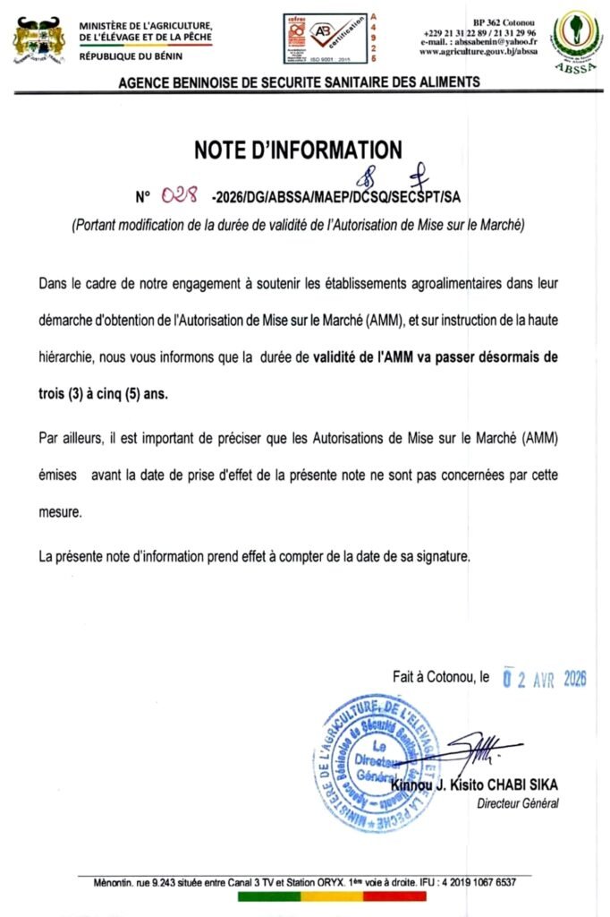 Lecture: Sécurité sanitaire des aliments au Bénin: L’Autorisation de Mise sur le Marché désormais valable 05 ans