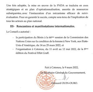 Le conseil des ministres du mercredi 09 mars 2022 a adopté l’autorisation de l’accord de signature de subvention du MCC. La rencontre hebdomadaire des ministres sous la présidence du président Patrice Talon a adopté d’autres décisions.