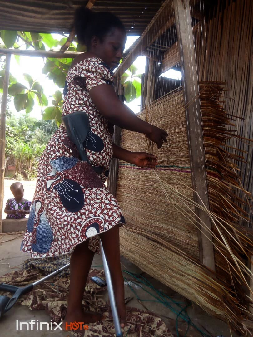 Coiffeuse de profession, dame Brigitte Sohloué vit aujourd’hui de l’activité de tissage de nattes. Cette mère de famille en situation de handicap habite Djèkountomey, un quartier de la ville de Lokossa.