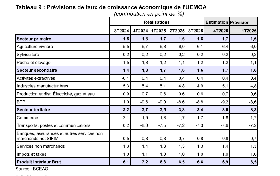 Le taux de croissance du PIB réel de l’UEMOA ressortirait à 6,5% au premier trimestre 2026, après 6,9% au quatrième trimestre 2025. C’est ce que renseigne la note de conjoncture économique dans les pays de l’UEMOA de la Banque centrale des Etats de l’Afrique de l’Ouest (BCEAO).