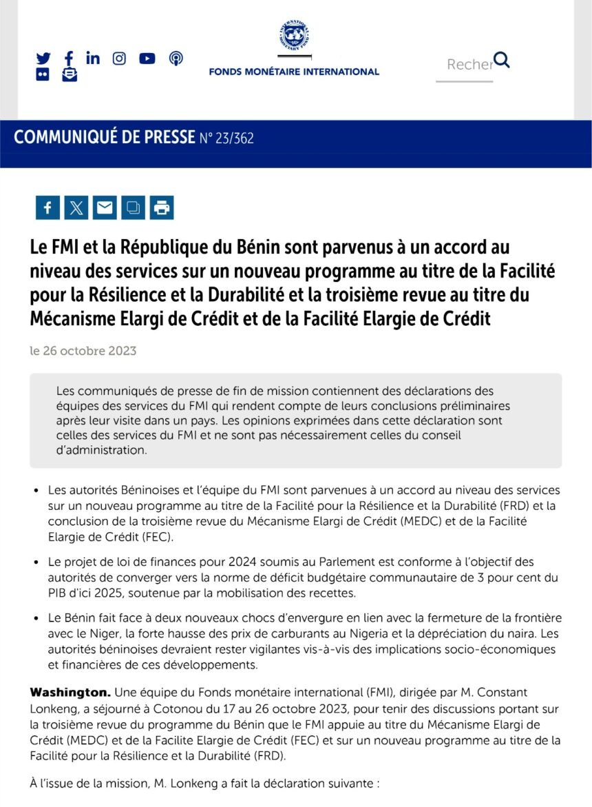 Le Bénin aura bientôt un nouvel appui financier du Fonds Monétaire International (FMI). Une équipe du FMI était en mission à Cotonou du 17 au 26 octobre 2023, pour tenir des discussions portant sur la troisième revue du programme du Bénin que le FMI appuie au titre du Mécanisme Elargi de Crédit (MEDC) et de la Facilite Elargie de Crédit (FEC) et sur un nouveau programme au titre de la Facilité pour la Résilience et la Durabilité (FRD). Au terme des échanges avec divers responsables, un accord a été signé entre les deux parties. Lire le communiqué final