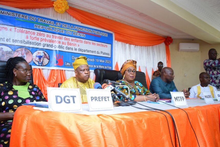 C’est dans une salle de conférence archicomble de la mairie de Pobè que s’est déroulé le vendredi 19 mai 2023, le lancement de la campagne « Tolérance zéro au travail des enfants dans les secteurs à forte prévalence du Bénin » dans le département du Plateau, suivi de sensibilisation grand public. A l’occasion, tous les acteurs ont été mobilisés. Il s’agit des autorités politico-administratives du département, des représentants des Organisations Non Gouvernementales, des dignitaires, sages, majestés et têtes couronnées de la Commune de Pobè, des artisans, des associations des usagers des marchés et autres.